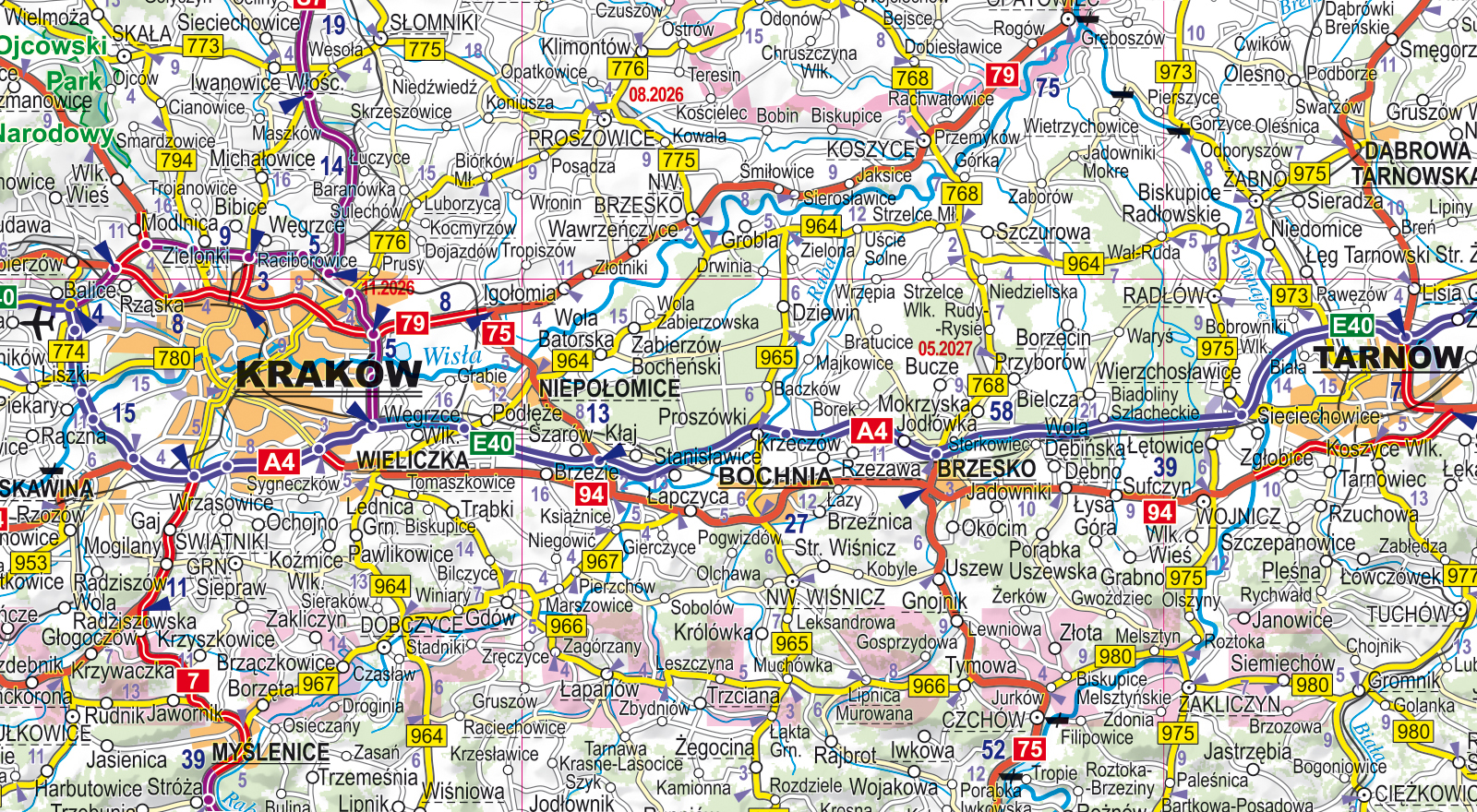 • odległości drogowe w kilometrach, szczegółową numerację dróg,